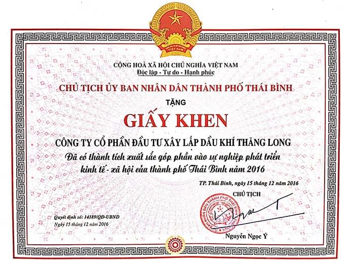Vừa qua trong hội nghỉ tổng kết hoạt động năm 2016, Công ty đã vinh dự nhận giấy khen của UBND thành phố Thái Bình vì thành tích xuất sắc trong sự nghiệp góp phần phát triển kinh tế xã hội thành phố.